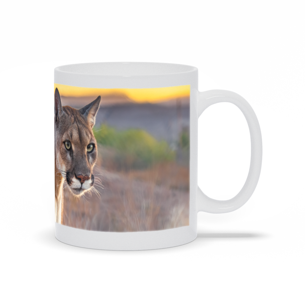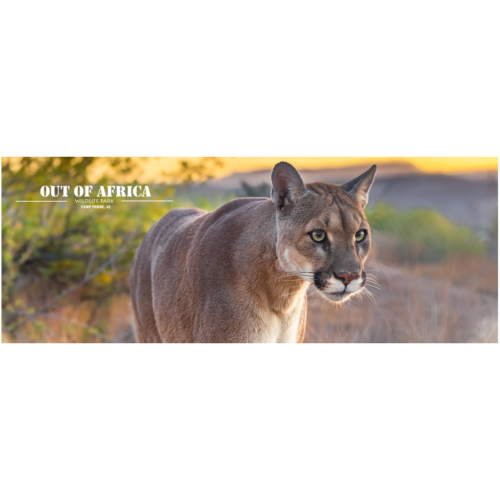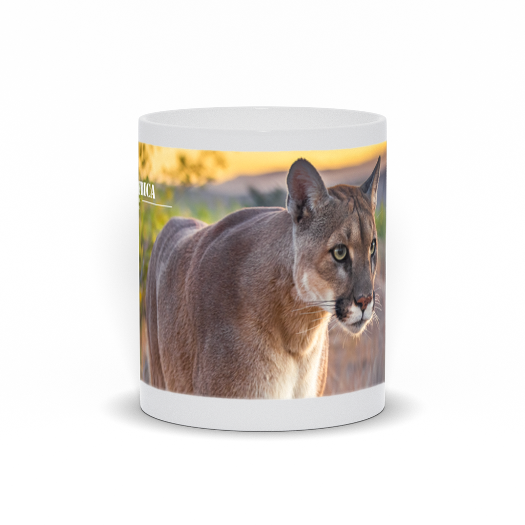 Start your day with the fierce beauty of the wild with the "Sunset Stalker" Mountain Lion Mug, featuring a captivating photograph by renowned wildlife photographer Jay Cline. This exclusive 11oz mug, available only through Out of Africa Wildlife Park, captures the stealth and grace of a mountain lion as it prowls through the twilight, bathed in the warm glow of the setting sun. Perfect for your morning coffee or evening tea, this mug brings the untamed spirit of the wilderness into your daily routine.